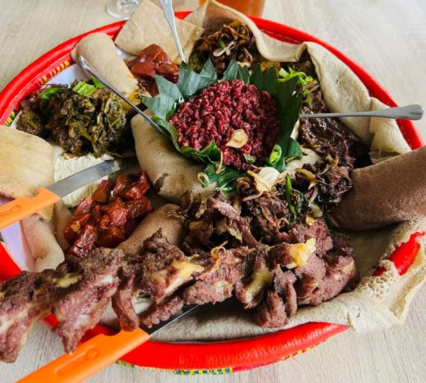 Lean fresh beef minced and lightly seasoned with spiced butter and mit’mitt’a (spiced ground chili pepper), raw, rare, medium or well done