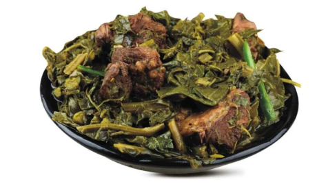 Boiled fresh collard green sautéed with beef chunks, onion, garlic and ginger