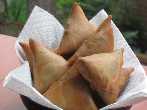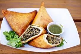 3 pieces of deep fried pastry shell filled with lentils, onion, herbs, and serrano pepper